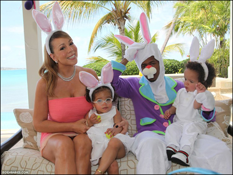 The 43-year-old entertainer was obviously enjoying her break from American Idol judging duties and getting in the Easter spirit. In another picture, Mariah is seen cradling daughter Monroe who looks cute in pink tiara and bib while Nick is smiling broadly behind shy son Moroccan.
