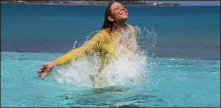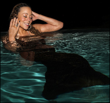 For an evening swim, the 43-year-old singer took the plunge into a pool fully dressed in an expensive black strapless designer gown and diamond jewels. Looking like a mermaid in the fishtail ensemble, the songstress is seen pushing back her wet locks as she smiles for the camera.