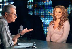 |  | | Larry King and Mariah, December 16, 2002 | | Legendary status aside, let's get the obvious jokes out of the way with regard to the CNN special Larry King - 50 Years of Pop Culture. Alternate titles might include: 50 Years of Awkward Questions; 50 Years of Interrupting Guests; 50 Years of Random Thoughts; 50 Years, One Pair of Suspenders; and, of course, 50 Years, 50 Wives.